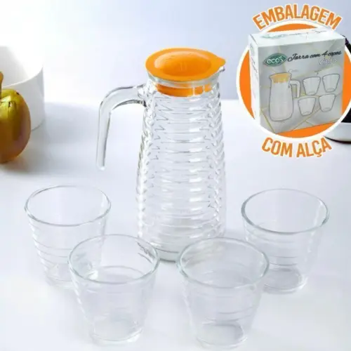 Jarra de Vidro com Alça + 4 Copos ECO23083 – Conjunto Elegante e Resistente