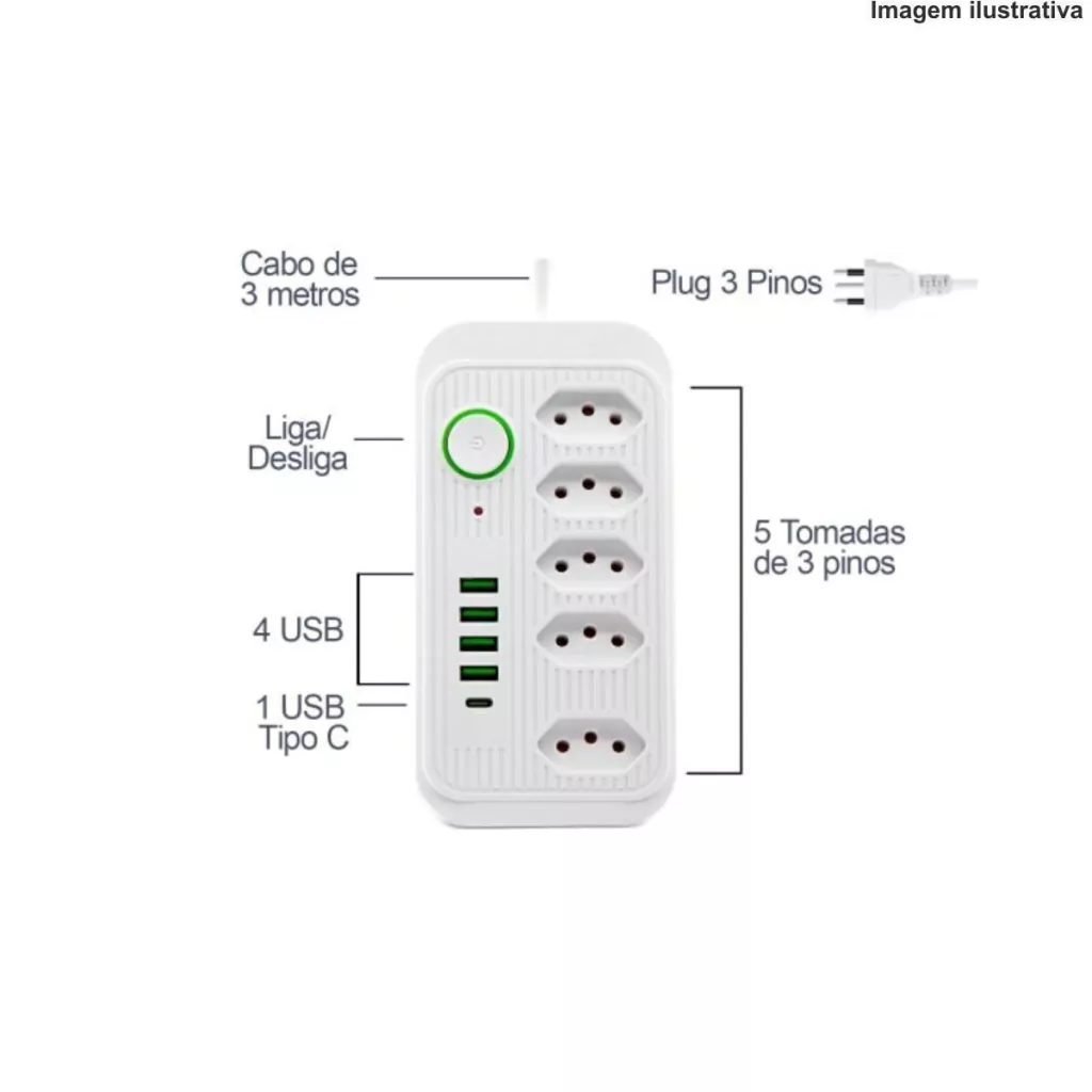Proteja e conecte seus dispositivos com o Filtro de Linha 3 Metros. Com 5 tomadas e 4 portas USB, oferece praticidade e segurança.