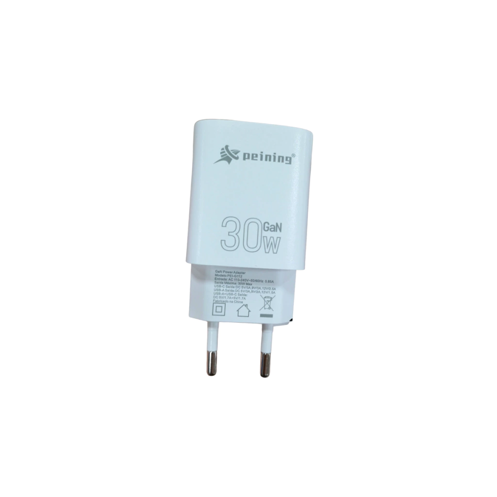 A FONTE GAN 30W 1 USBC + 1 USB PEI-G112 oferece carregamento rápido e eficiente para seus dispositivos. Com tecnologia GaN, é compacta, segura e ideal para uso diário.