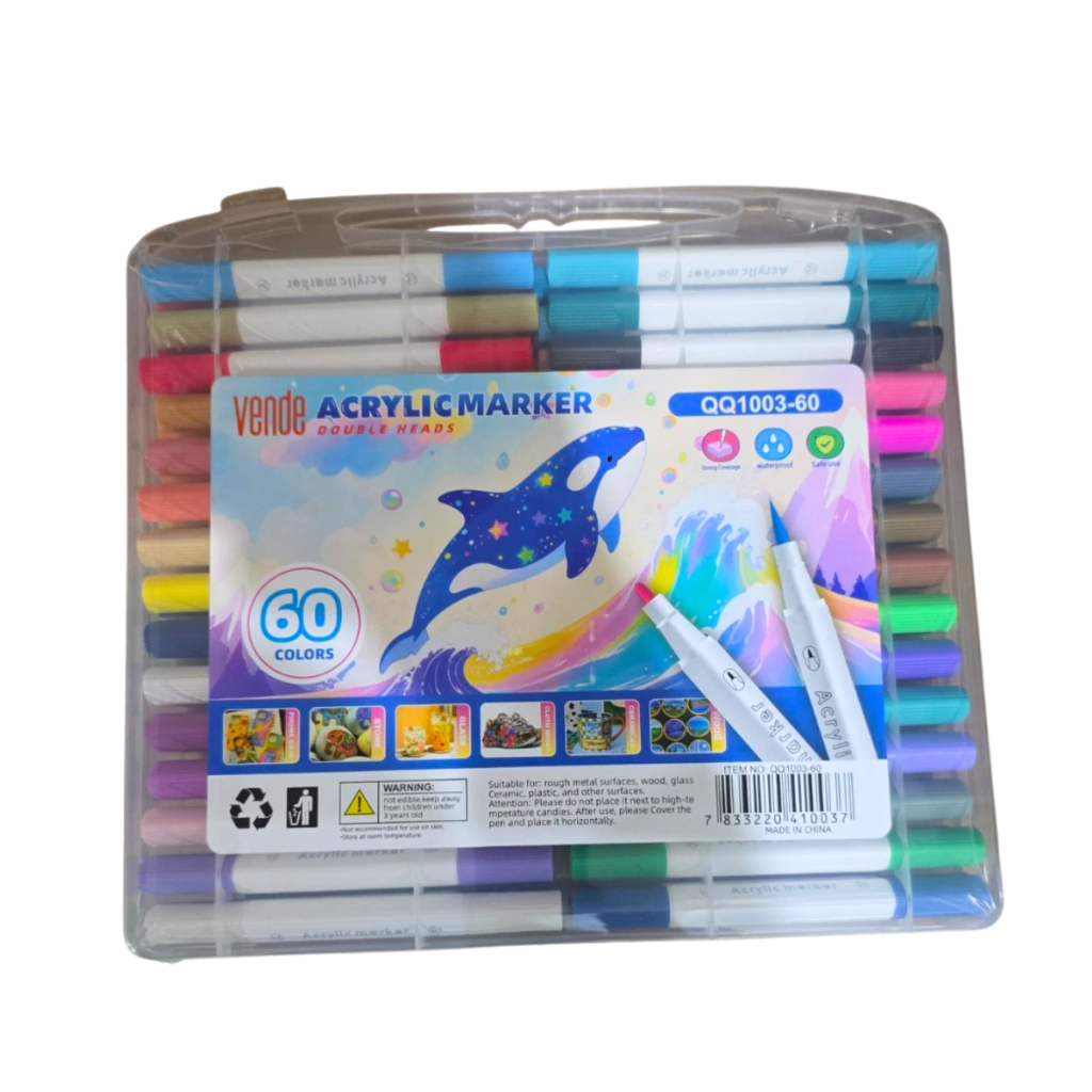 O KIT 60 Canetinhas Acrílicas Duas Pontas QQ1003-60 é perfeito para quem busca criatividade e versatilidade. Possui 60 cores vibrantes e duas pontas: uma fina para detalhes e outra grossa para preenchimentos. Ideal para artesanato, lettering, desenhos e pinturas.
