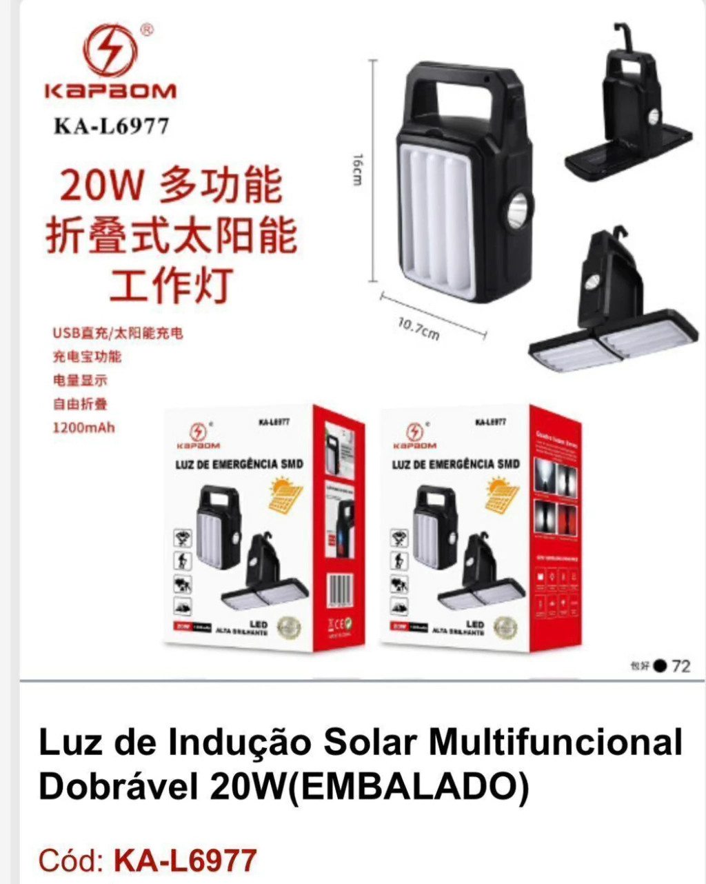 LUZ DE EMERGÊNCIA INDUÇÃO SOLAR LED 20W KA-L6977