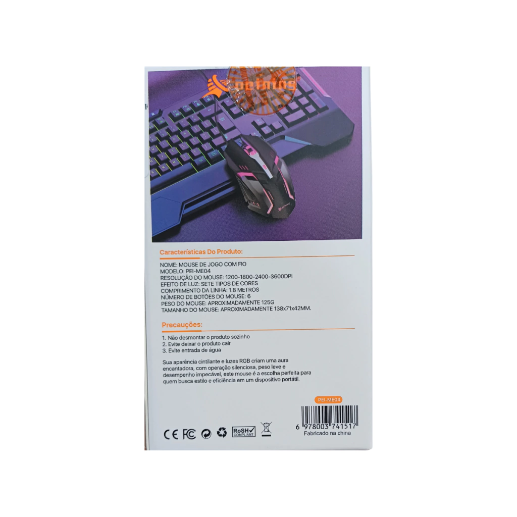 Mouse Gamer com Fio 3600DPI RGB PEI-ME04 – Alta Precisão e Iluminação Vibrante